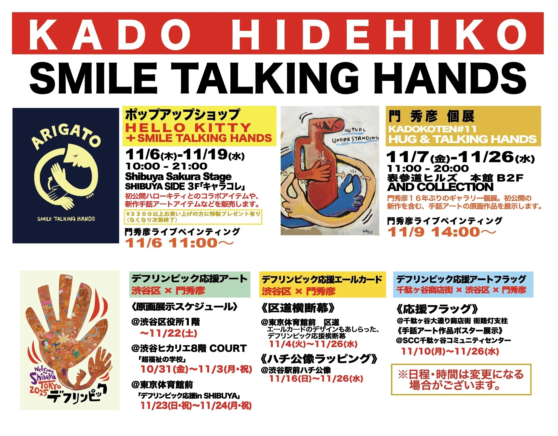 また、デフリンピック開催の渋谷区にて門秀彦デザインのデフリンピック応援フラッグや、応援アートをモチーフにした展示が数多くの場所で掲示される予定です。